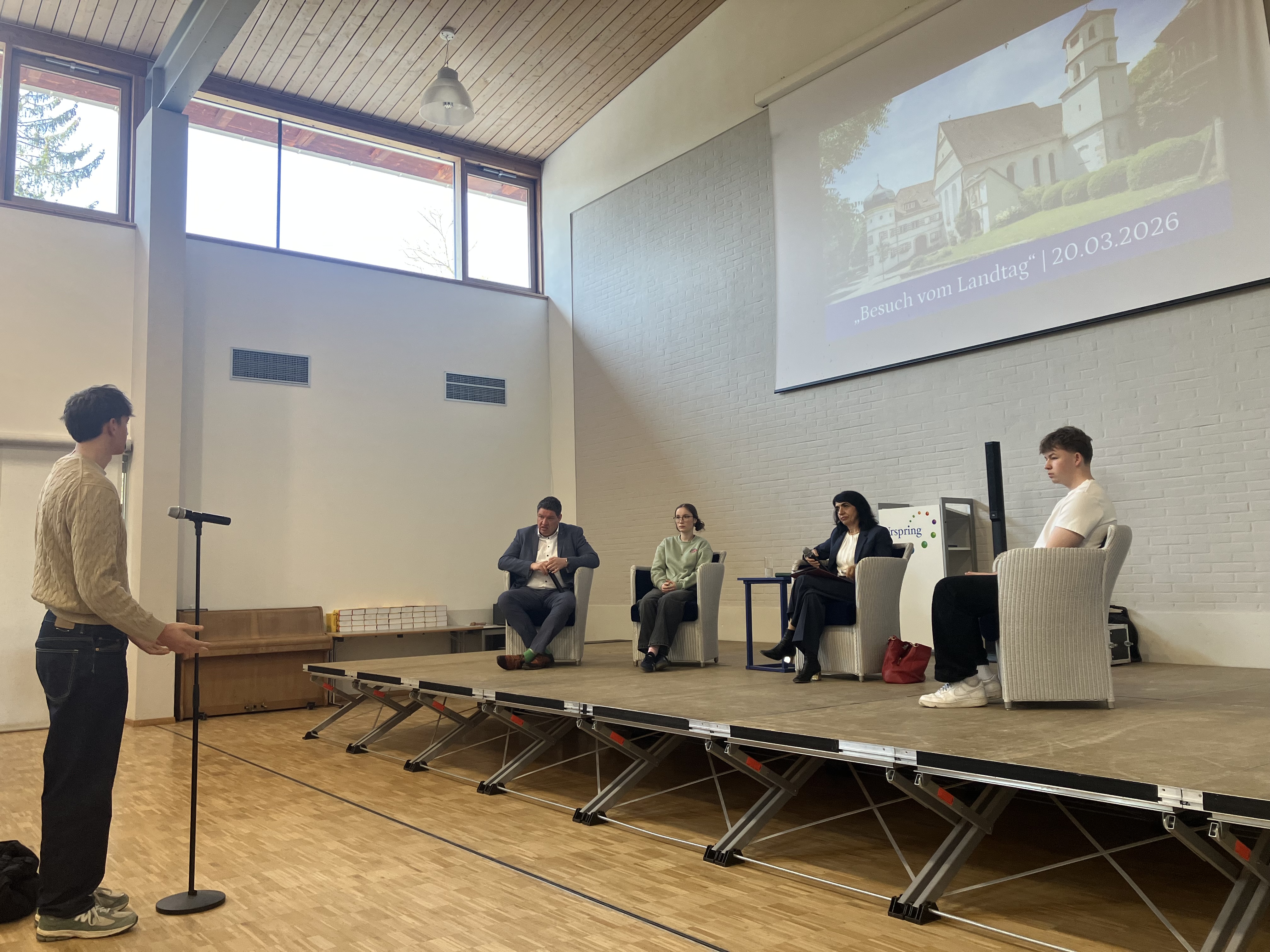 Beim „Schulbesuch vom Landtag“ bekamen unsere Schülerinnen und Schüler einen direkten Einblick in die Zusammensetzung und Arbeit des Landtags, welche Aufgaben das Parlament hat und wie politische Entscheidungen getroffen werden. Zu Gast in Urspring war Landtagspräsidentin Muhterem Aras ganz persönlich, die in ihre Aufgaben und ihre Verantwortung hautnah blicken ließ.Dem Landtag Baden-Württemberg ist es ein besonderes Anliegen, junge Menschen für Politik zu begeistern und sie zur aktiven Mitgestaltung unserer Gesellschaft zu ermutigen. Deshalb suchen Vertreterinnen und Vertreter des Landtags gezielt den Dialog mit Schülerinnen und Schülern, um aus erster Hand zu erklären, wie Demokratie funktioniert und welche Rechte und Möglichkeiten der politschen Teilhabe der Bürgerinnen und Bürger.