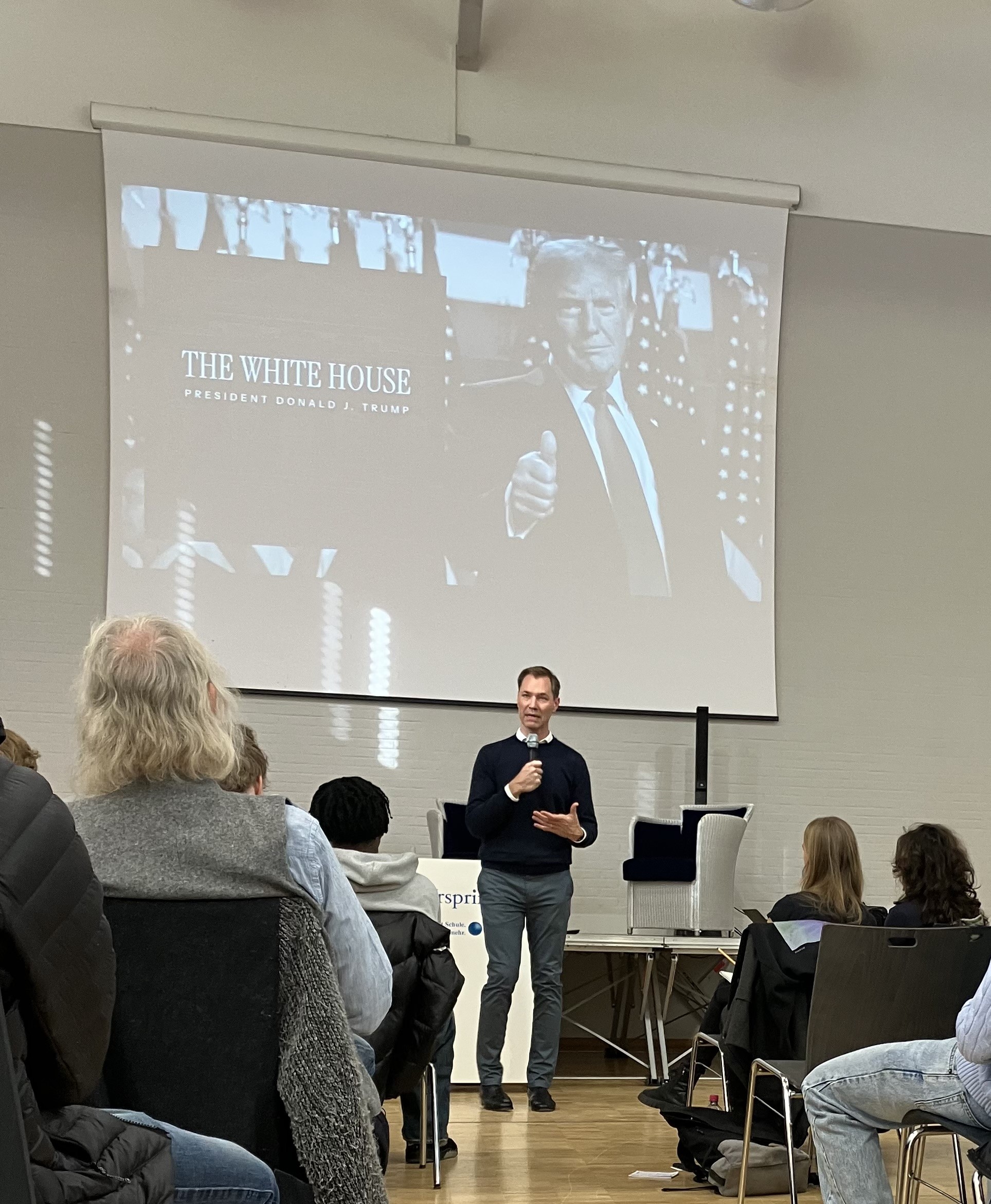 Julius van de Laar (Abitur 2002) ist Kampagnen- und Strategieberater mit langjähriger internationaler Erfahrung im politischen Campaigning. Zudem zählt er zu den gefragtesten Beobachtern der amerikanischen Politik und Gesellschaft.Im intensiven Austausch zwischen ihm und unseren Schülerinnen und Schülern der Oberstufe ging es vor allem um den amerikanischen Präsidenten Donald Trump – als Beispiel für einen politischen Wahlerfolg, der vor allem durch das Schüren von Ängsten (Verlust, Gefahr) und das Versprechen, diese beseitigen zu können, zustande kam.