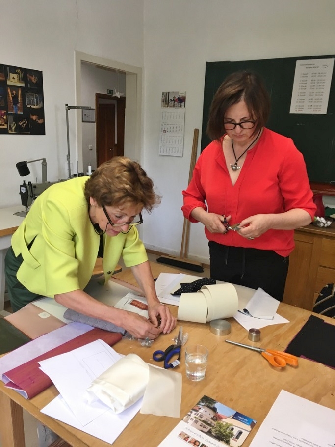Am Montag, 27. Mai 2019, hatten wir die Maßschneider-Innung zu Gast in der Urspringer Schneiderei. Unser Tagesplan war reich gefüllt mit einem Workshop zur Handtaschenverarbeitung unter der Leitung von Schneidermeisterin und Ausbilderin Brigitte Thanner-Mang, einer historischen Führung durch Hans-Martin Meth und einer Innungsversammlung.Sieben Teilnehmerinnen haben am Vormittag eine Clutch aus unterschiedlichen Materialien in rationeller Technik gefertigt – der Workshop lief unter dem Titel „Clutch Ratz-Fatz" und trug seinen Namen zurecht!